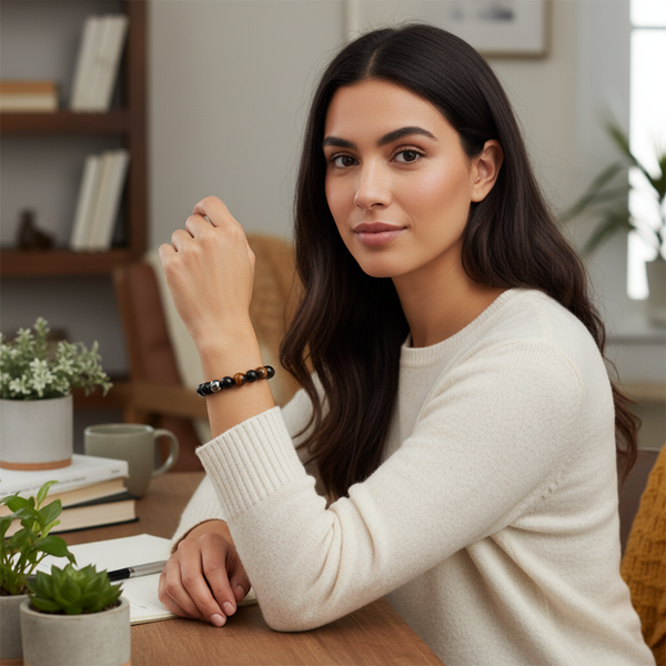 Tiger Eye, Hematite, and Obsidian unite to balance body, mind, and spirit while enhancing focus, courage, and stability.